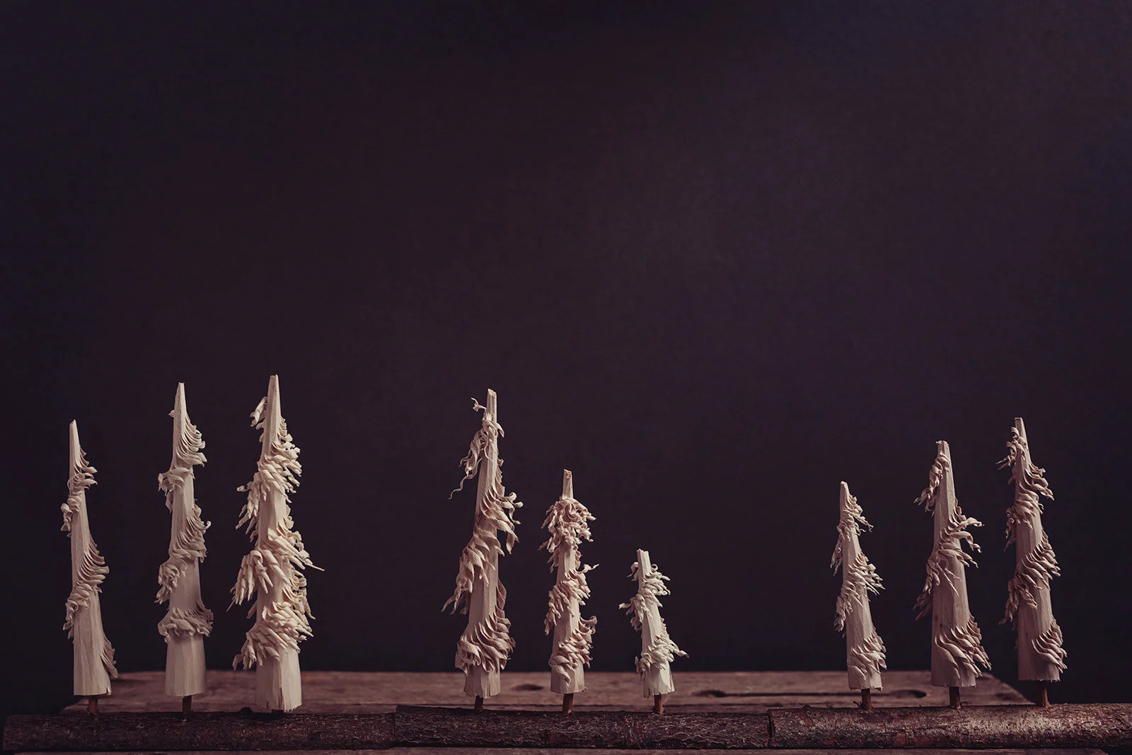 3 twizzley trees planted into a hazel base make up the Laal Forest (little forest). Hand carved from locally coppiced hazel.